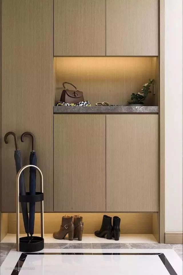 玄关处的定制鞋柜,一定要预留15~25公分的常鞋位放常穿的两双鞋,脱下来踢到里面就可以了。