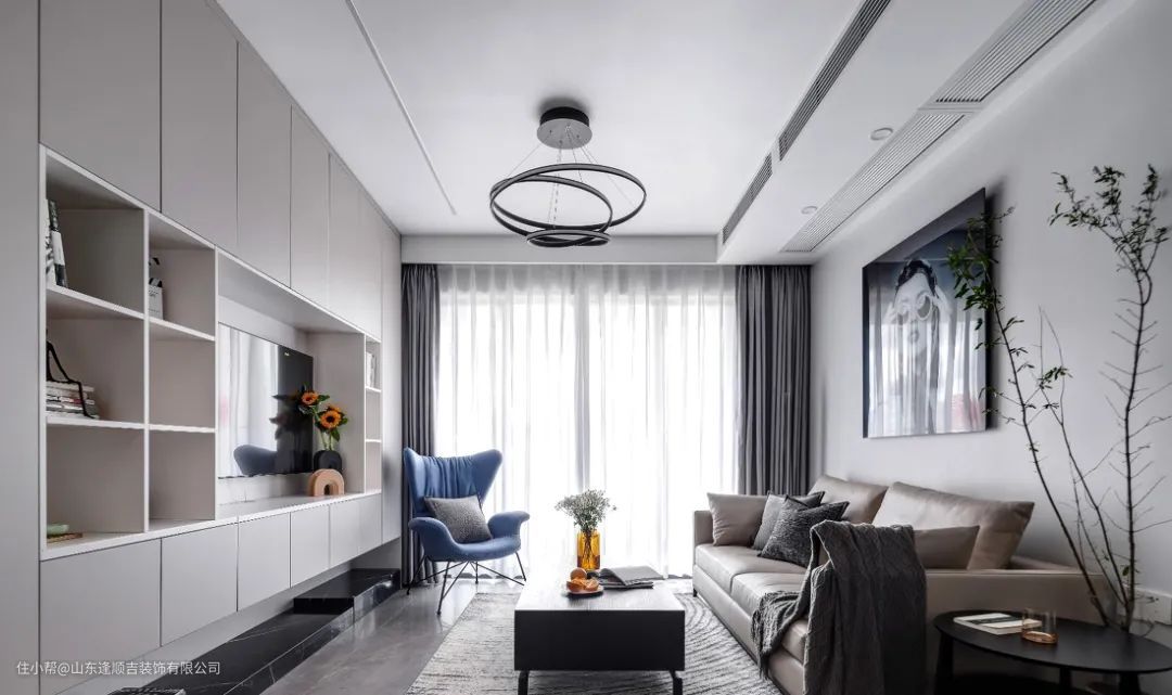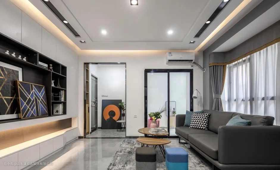 轨道灯搭配前面的筒灯和灯带,可以做成"见光不见灯"的无主灯设计,单独做轨道灯的话,可以不用做吊顶,还可以随意拆卸,不仅应用在客厅,还能在玄关、餐厅和厨房,照射到一些照不到的"死角",让家更明亮。