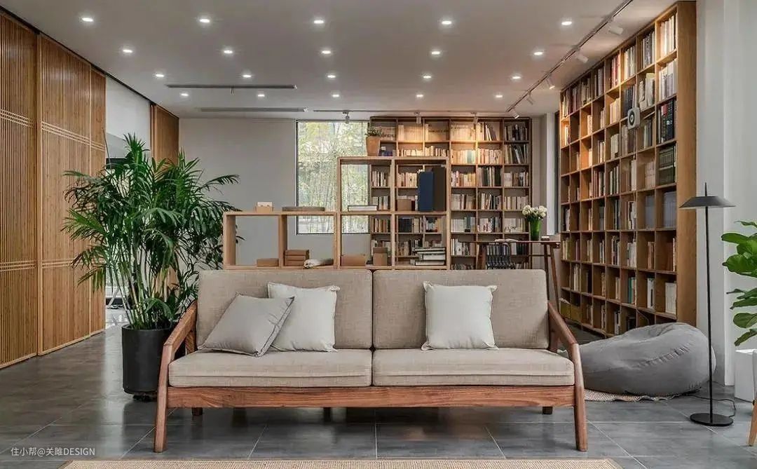 沙发往前挪10~20cm,后面可以做个书柜,扭头就能拿到书,太适合各位书虫啦。书柜作为沙发墙,也非常有装饰感。