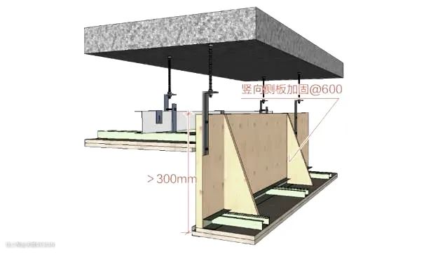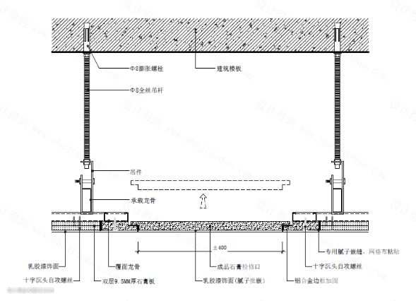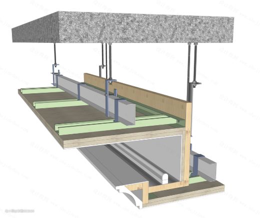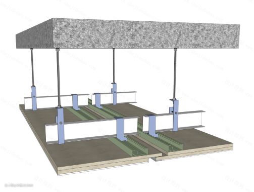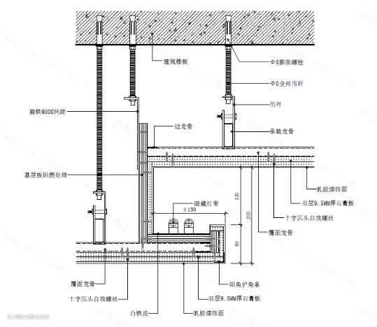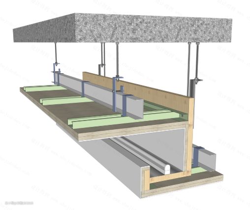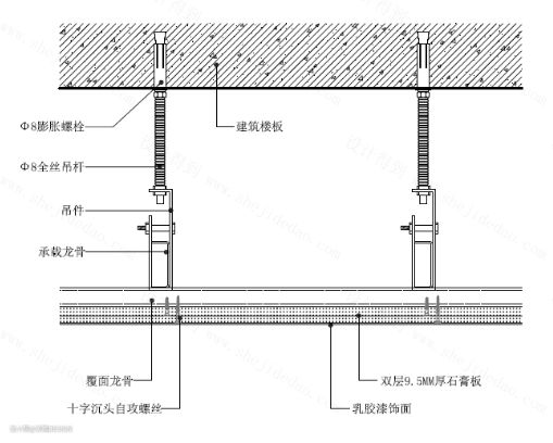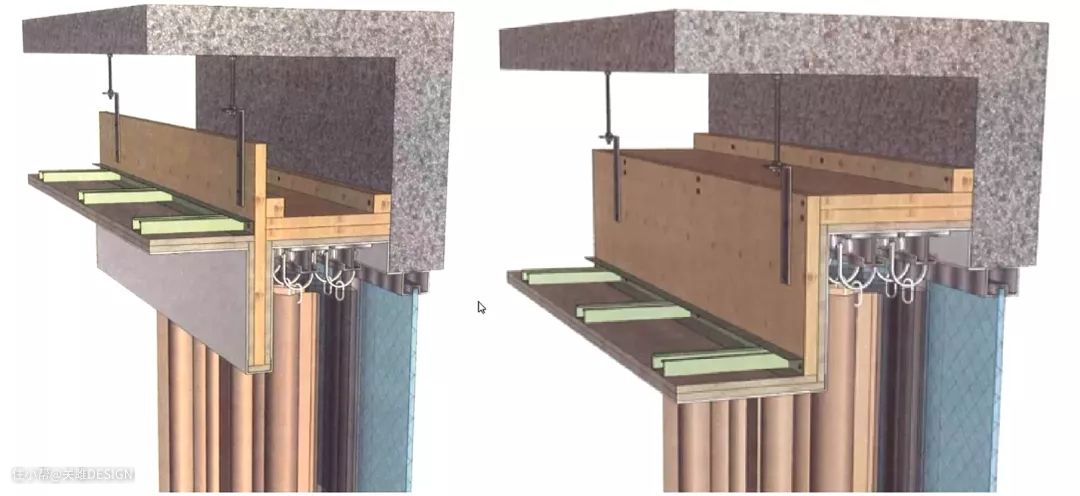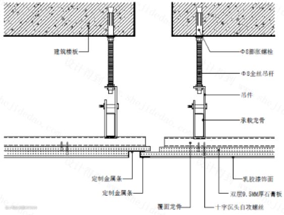 另外,不管侧板是木板还是金属骨架,均需单独安装吊筋,且间距建议≤1200mm;若侧板造型较重,则需采用角钢作为吊筋,吊筋与木侧板造型用对接螺栓固定。