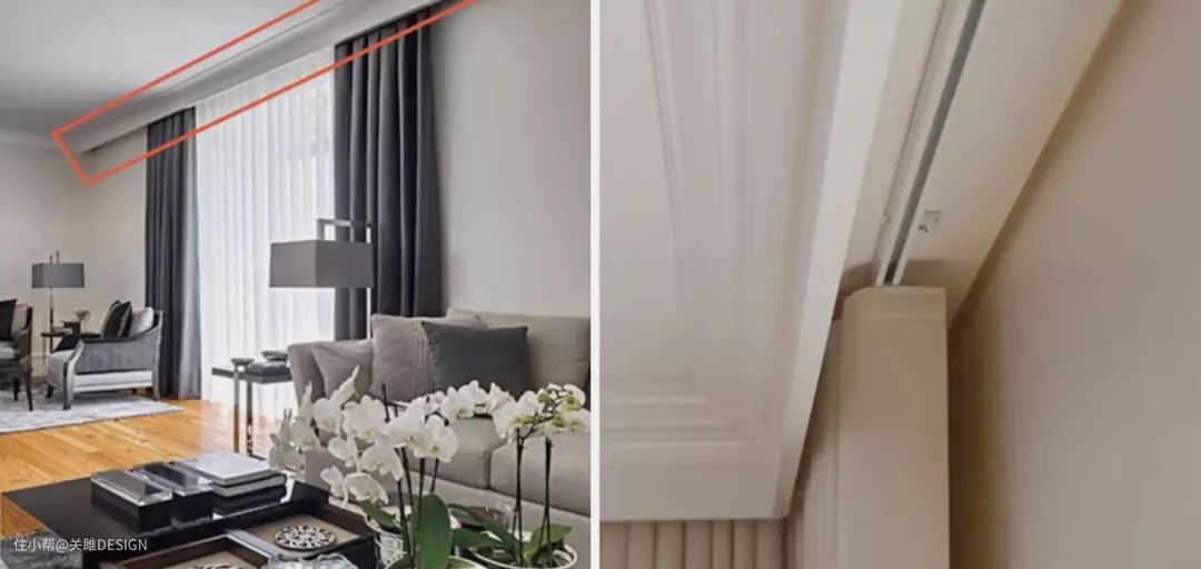 窗帘盒的把控要点:多考虑固定窗帘轨道的承载力,窗帘越重,基层就需要越牢固,越重就需要越强的握钉力,比如采用9mm或18mm的层板来承载窗帘轨道的重量。
