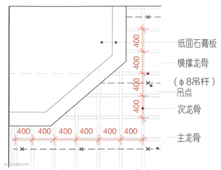 需要注意的是需要检修口或吊顶加固时,会在次龙骨垂直的方向设立横撑龙骨,主要是为了让吊顶更加稳固,常规项目中使用比较少。