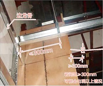 最侧面的吊筋距墙面<300mm,同时保证与主龙骨方向的吊筋处于一条直线上,防止与灯具的位置冲突。
