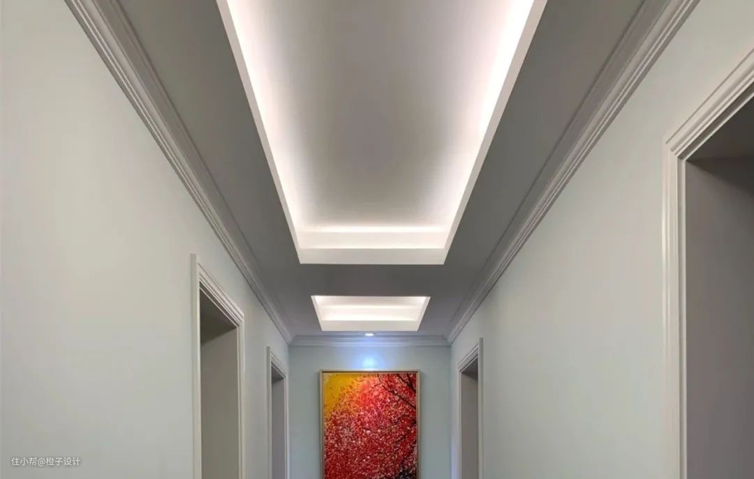 ▲走廊四周吊顶隐藏横梁,中间留空一个区域,装上吸顶灯,整体空间显得有层次美感。