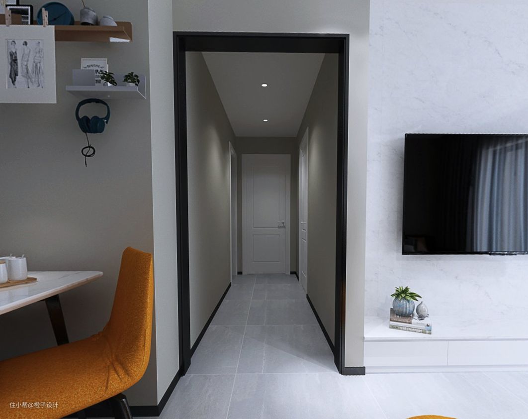 因为走廊与客厅交界位置一般都是会有横梁的存在,因此走廊或多或少都是需要做吊顶的,而在吊顶的时候,可以把中间区域留空出来,然后在上面装一个小尺寸的吸顶灯,这样走廊空间显得简约层次而又明亮舒适,让小空间也显得更加档次优雅。