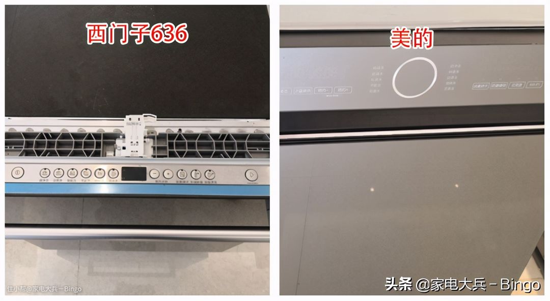 西门子636由于面板是需要独立购买(支持定制),所以厂家把操作面板做在了洗碗机的上方。美的P40出厂自带面板,操作界面就直接做成了触摸屏,科技感更加浓郁。