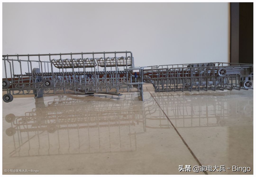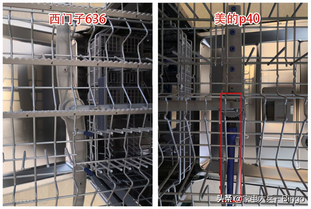 上面这张图中,左边是西门子636的碗篮,右边是美的P40的碗篮。从实际上来看,国产的西门子洗碗机也是按照中国人习惯来设计的,如果是进口西门子洗碗机,你就会发现,碗篮不应该叫“碗篮”,而应该叫“盘篮”,毕竟外国人多用盘子,而很少用碗。在碗篮的材质上,两个洗碗机的碗篮都被磁铁吸附了,所以它们都是“铁+塑包”的。