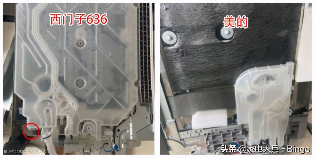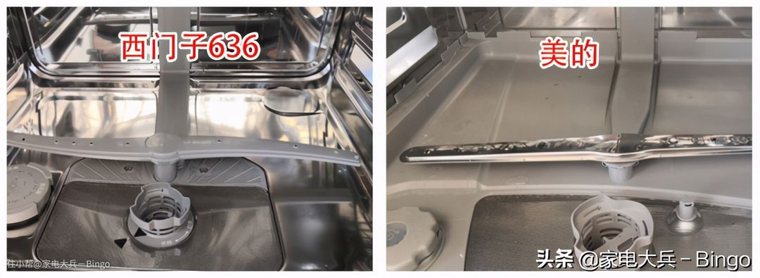 左边是美的P40内胆,四壁使用的是不锈钢,底部采用的是塑料;右边是西门子636的全钢内胆。前面讲喷淋臂时也讲过,相较而言,不锈钢内胆更不容易残留油污。