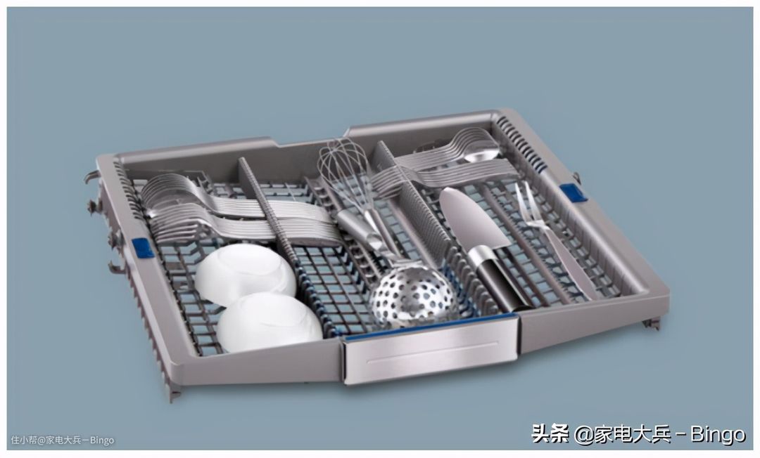 在进口的西门子洗碗机中,这个地方原来设计的是如上图所示的刀叉悬挂篮,应该是国产化后,考虑到饮食文化的差异,所以从减少成本、提高洗净率的角度出发,将此处改装成了一个旋转喷淋。