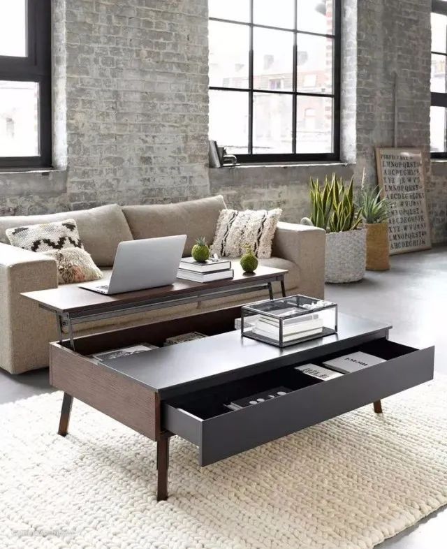 除了墙面空间,还可以“挖掘”一下茶几的“潜力”。茶几主要用来摆放茶水,表面也能做一些收纳和装饰。带有抽屉的则能收纳一些杂物,还有的多功能茶几能兼顾电脑桌的功能。