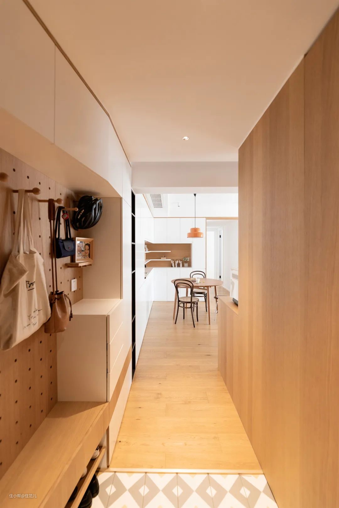 再看这套知行合一设计的65㎡案例,玄关柜与厨房的储物高柜一起定制。