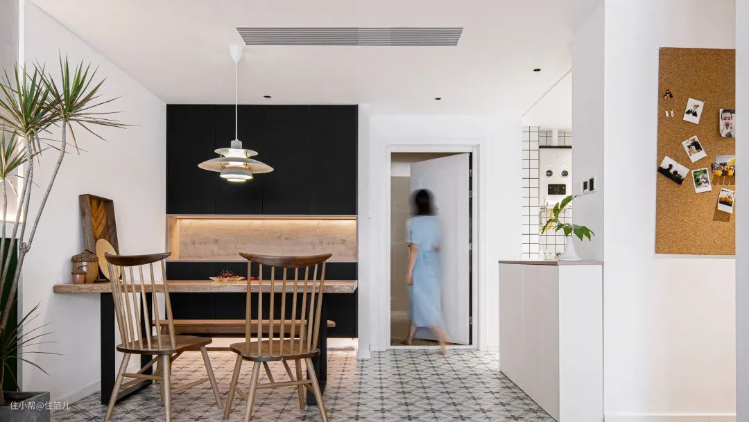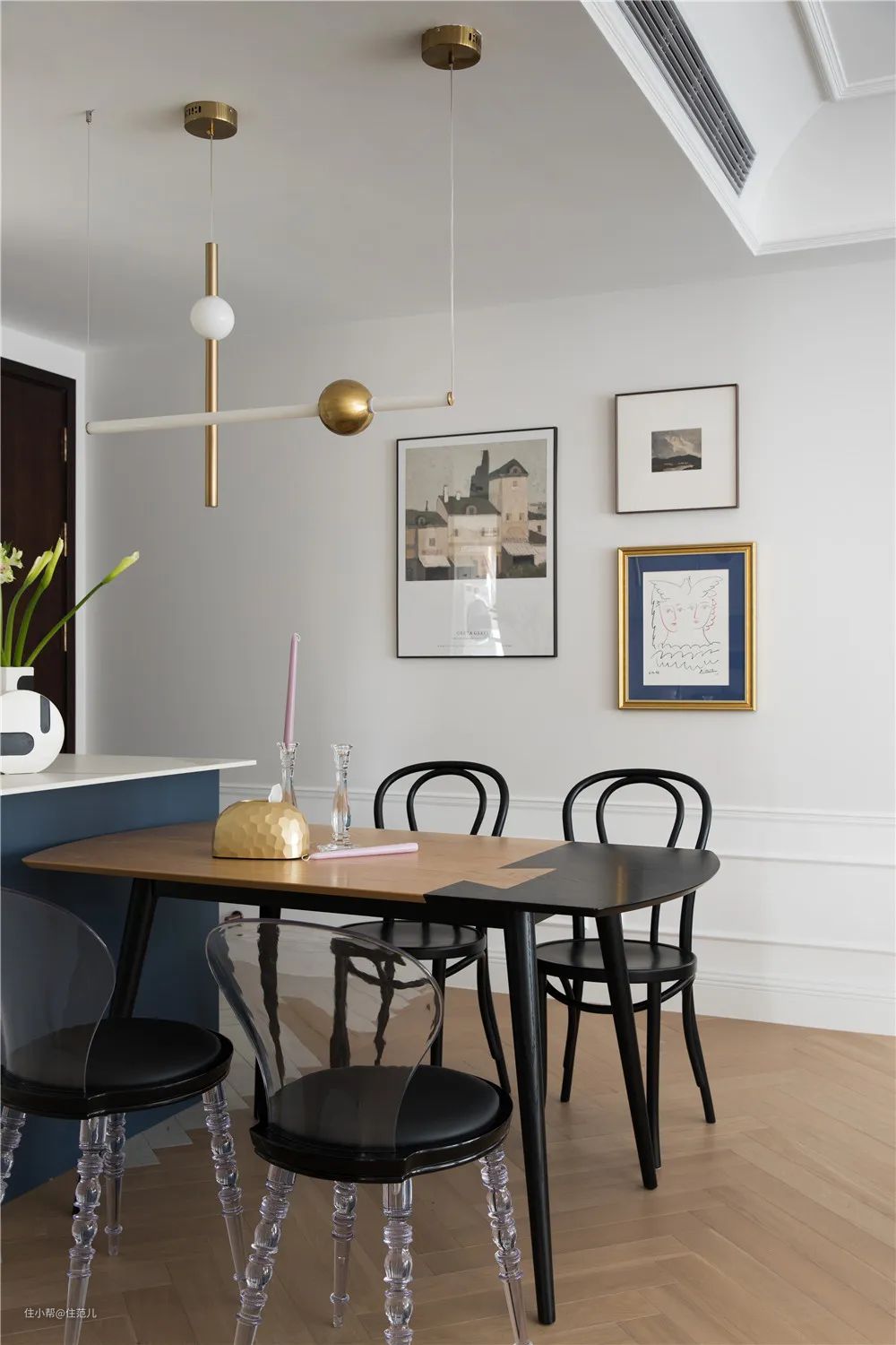 比如这个凡夫设计工作室的作品,一个90㎡法式风之家,进门右边是厨房,设计师在入户区域做了吧台柜+餐桌延伸设计,形成了一个非常舒服的入户动线。