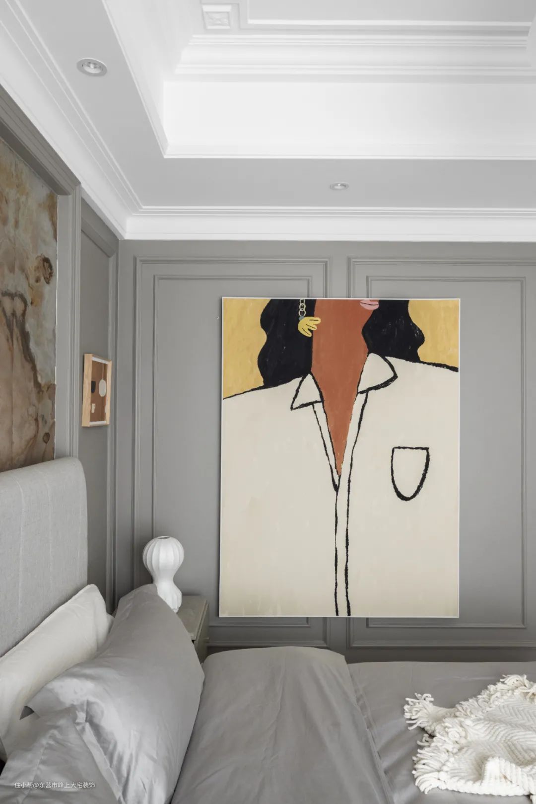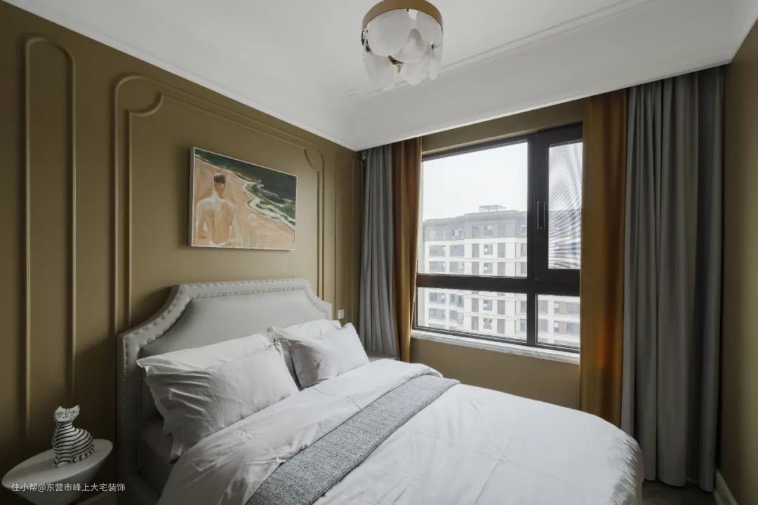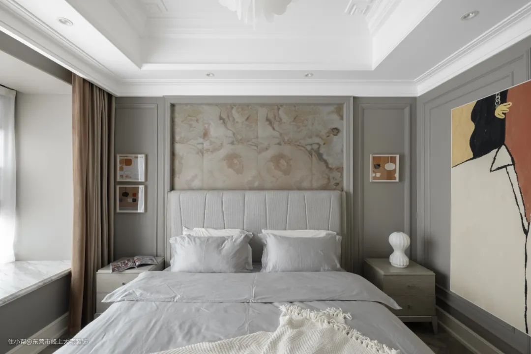 主卧保留了原始的吊顶,拆除了墙纸和床头背景墙上的硬包,保留了墙面木质线框,在框内用柔性石材装饰,整体墙面涂刷暖灰色乳胶漆,色彩统一又温馨舒适。
