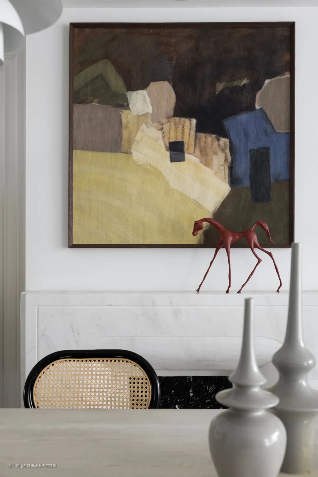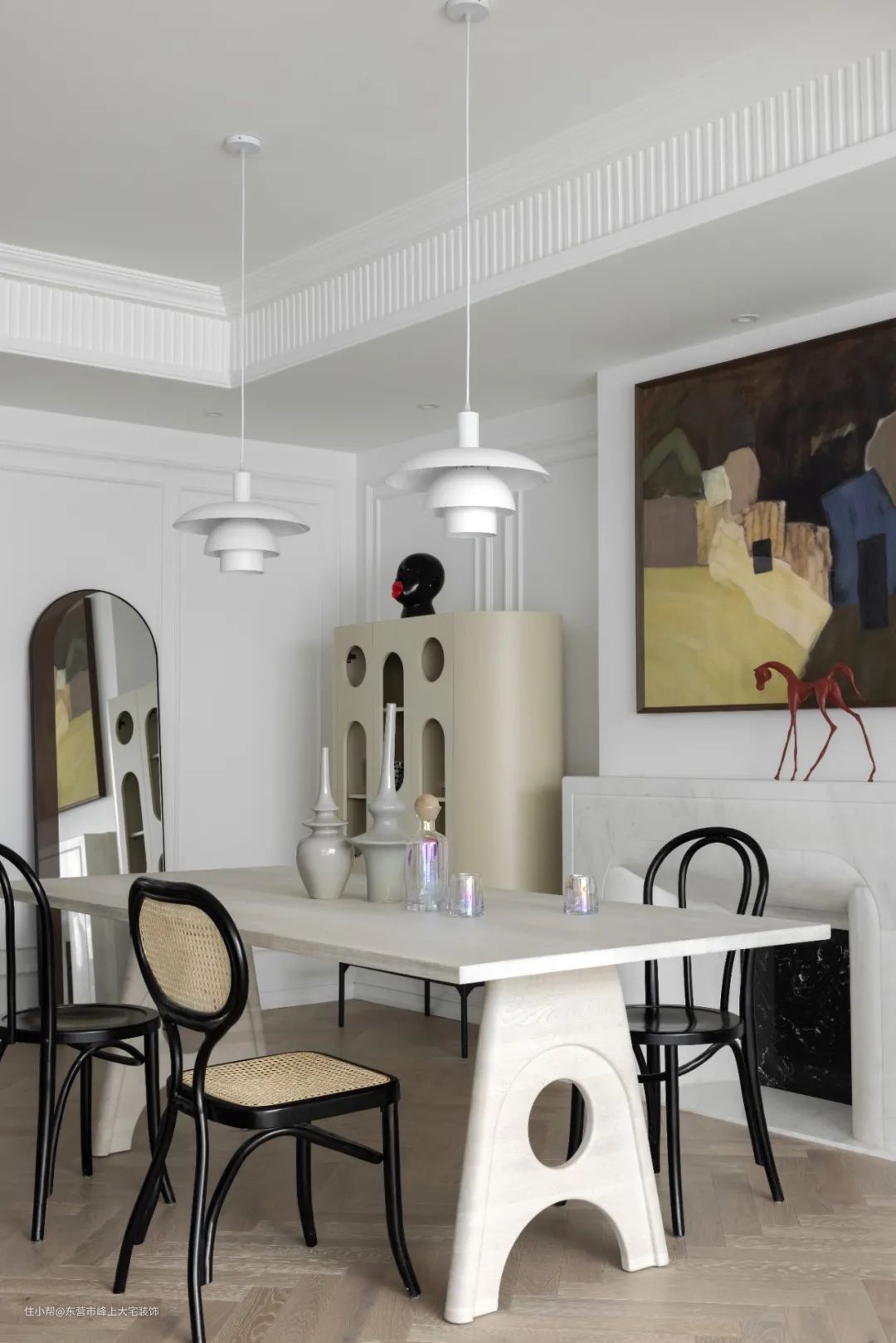 在壁炉左右两侧内凹处刻意选择了不同的餐边柜,在对称中融入了不对称的灵动与乐趣。