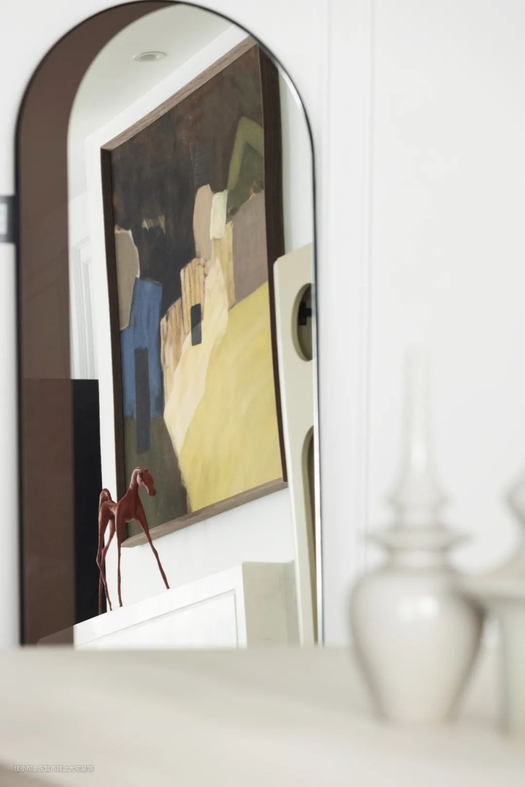 装饰挂画上女孩的蕾丝衬衣与客厅吊灯巧妙呼应,让空间更多了一丝女性的柔美。