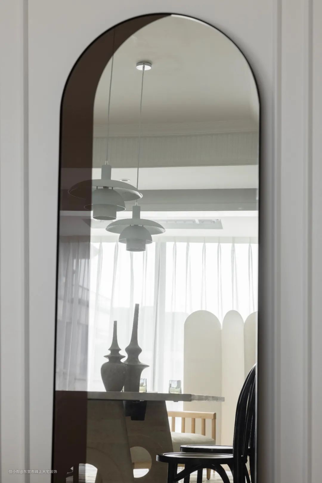 本次精装房改造保留了原始的房屋结构,在墙面和地面上进行了较大的改动。通过喷漆的方式把原本的猪肝色入户大门改为了典雅的浅灰色,连接玄关与餐厅的门洞也由方形改为了拱形,与左侧厨房门的椭圆造型相呼应,给空间增添了古典的韵味。