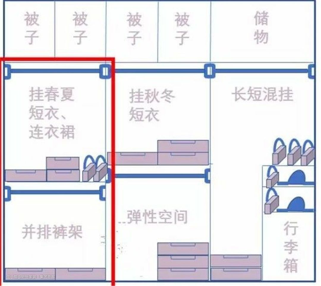 衣服悬挂基本会有三分区,最少也要两分区,上衣衬衫、裤子、裙子,分类细节要求更高,高度设计就会更严格。