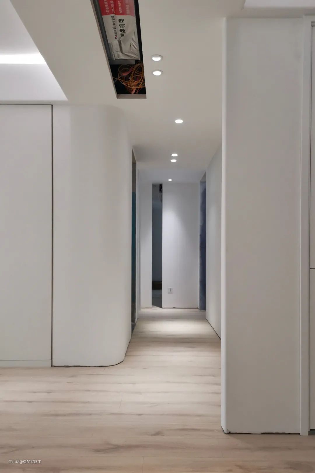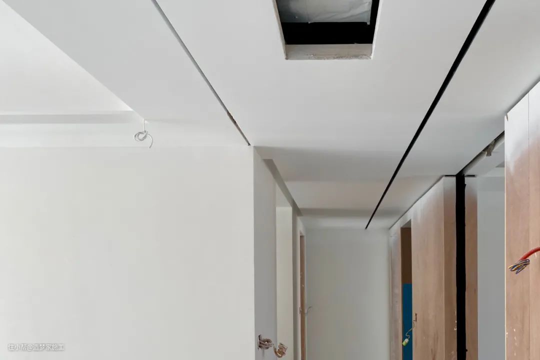 施工说明:顶面美线灯及磁吸灯做完漆后效果。顶面木饰面与乳胶漆收口采用金属扣条收口做离缝线条,简洁美观。