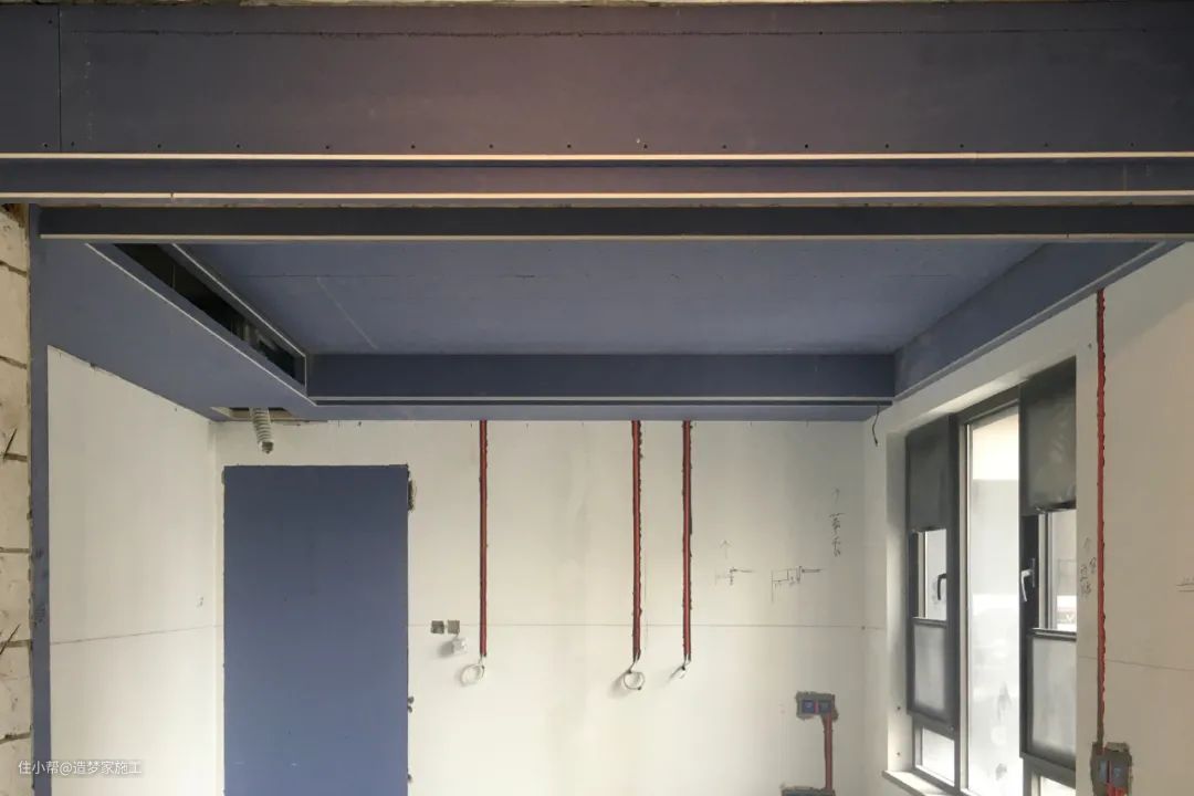施工说明:相邻管道之间必须通过管卡留有间距,防止后期抹灰空鼓;配电箱,预留50厘米~1米,线盒预留20厘米,灯线头预留50厘米。
