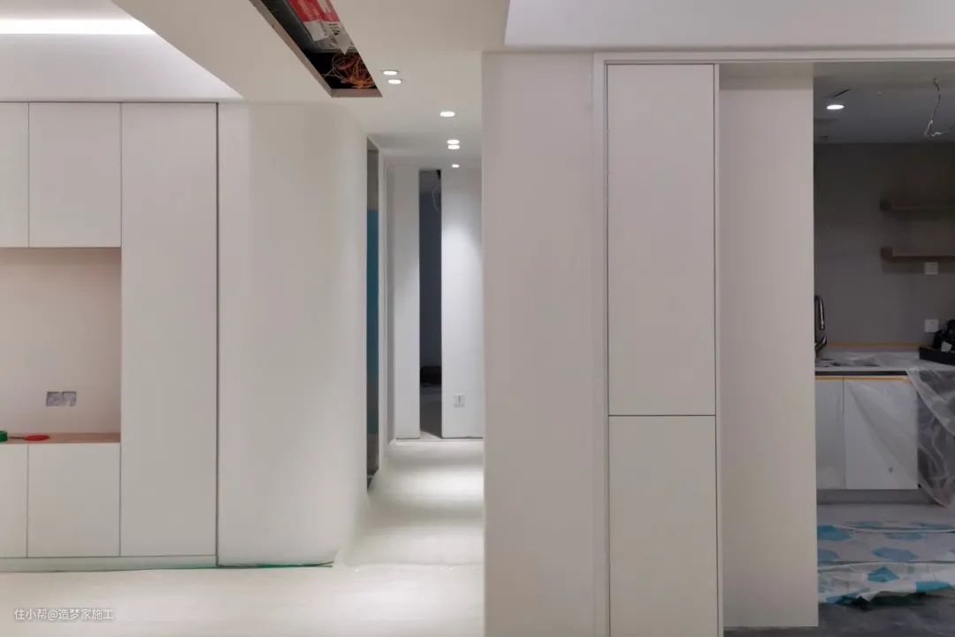 施工说明:墙面底漆及顶面面漆完工效果,腻子干燥后用打磨机对墙面进行大面积打磨,局部区域用手工砂纸进行打磨。先清理干净墙面浮灰,然后再滚涂底漆。底漆完成后,即可要求安装木门,定制家具类。