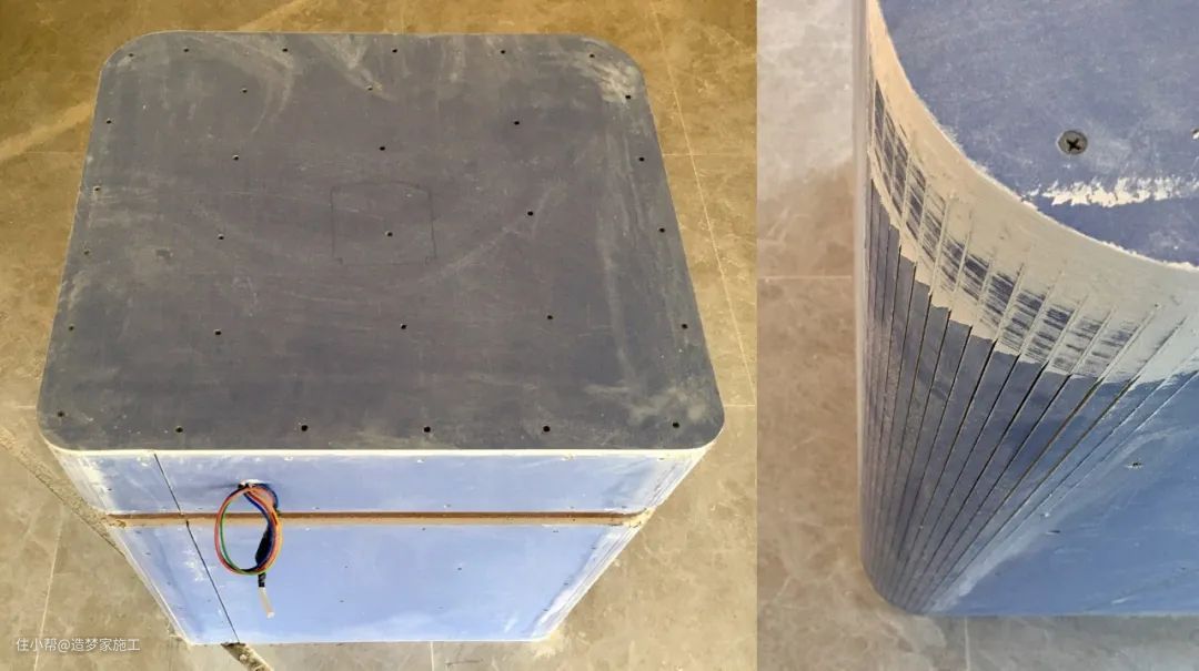 施工说明:柜体框架按照好后,贴上饰面板同色木皮收边。需要对木皮按照尺寸剪裁、修边,碰角用美工刀修成45度,白乳胶涂刷粘接,用熨斗烫平整。