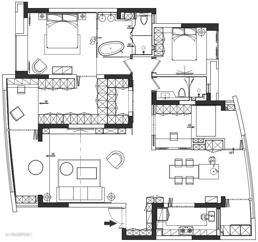 施工说明:精装房的改造过程是个性的展现,也是工匠手艺的舞台。分明的棱角中再点缀些许弧形的线条,体现生活之美。现场制作的吧台,与地面为同一饰面材质,融为一体;图2-3为半圆形洞口,去除了单调的门套,转角位置处理是重点。