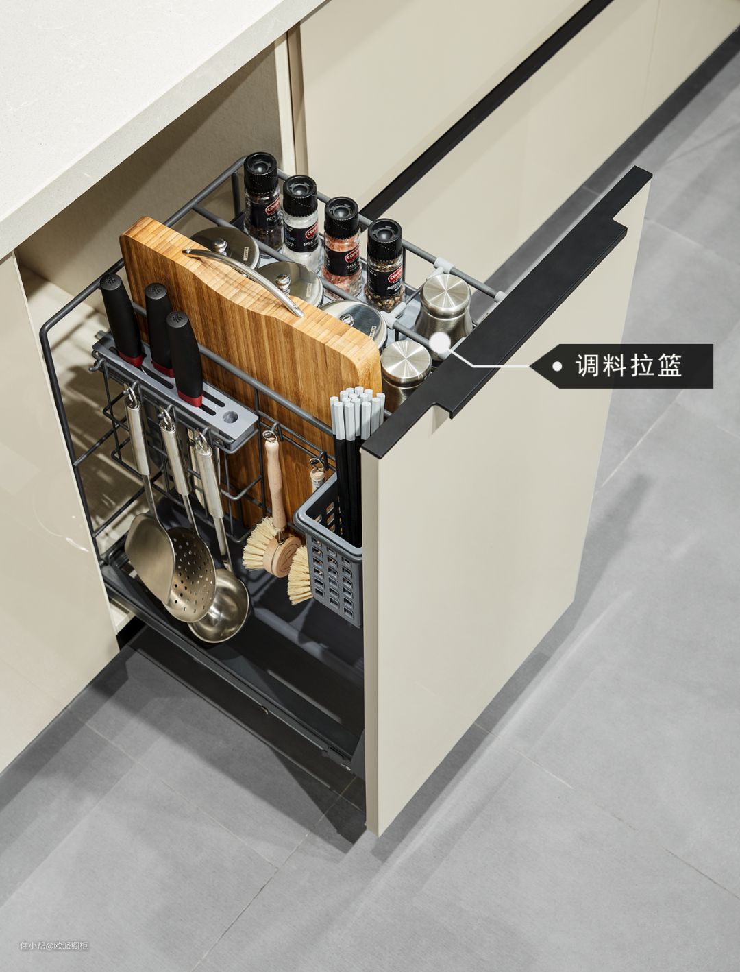 下拉式拉篮的好处在于收纳整齐,比起在台面上乱摆乱放,它可以让常用调料品的摆放看起来更加规整,平时轻轻一拉下来便触手可及,还不用担心瓶罐被油烟污染。