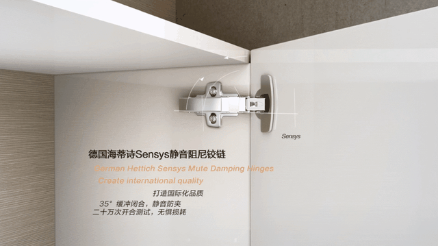 如德国海蒂诗Sensys静音阻尼铰链,外观时尚美观,内部自带隐藏式阻尼,能够35°缓冲闭合且开合无噪音,即使你突然松手,柜门也会缓缓地合上,不会发出碰撞声。
