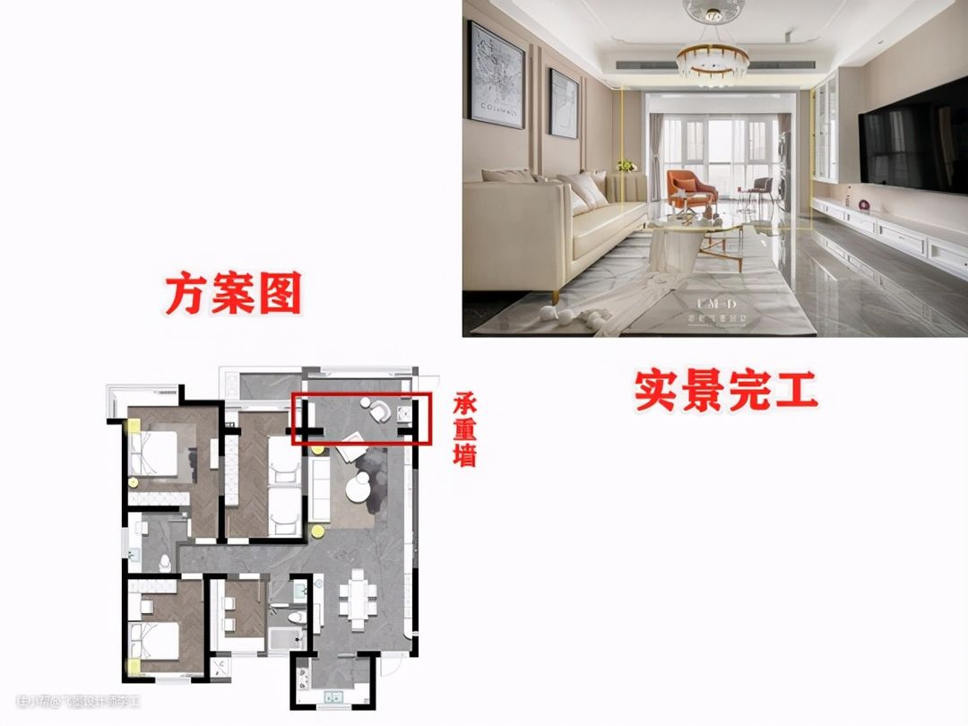 原本阳台与客厅之间有推拉门隔断,装修原本连带墙体全砸掉,但因为两侧的墙体属于承重墙,因此不能动,后期保留它作为垭口,包上门套,同样实现了阳台与客厅贯通,整个空间更显开阔、敞亮。