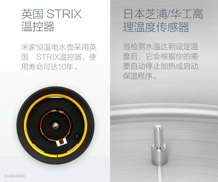 首先,这玩意从产品原则上来说,就是一个很不错的热水壶,作为小米中期探索的供应链降维打击的产品之一,其实这款产品堆料堆得挺成功。STRIX的温控器、日本芝浦的传感器、二段式阻尼开盖、食用级别304不锈钢,当时在国内国外的竞品里也算是很不错的表现了。