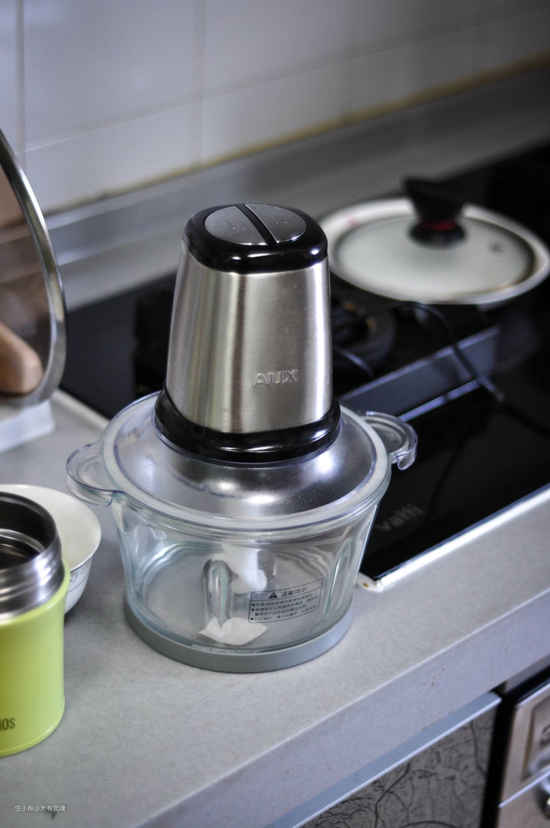 底下除了刀片,最重要的是容器,而奥克斯也还是挺厚道的,给了玻璃盆。一个经常下厨房的人就会知道,洗玻璃盆相对于其他各种奇奇怪怪的材质,差距实在是太大了。这个相当厚实且平滑的玻璃盆不管是装菜还是装肉都非常稳当,好用就一个字。