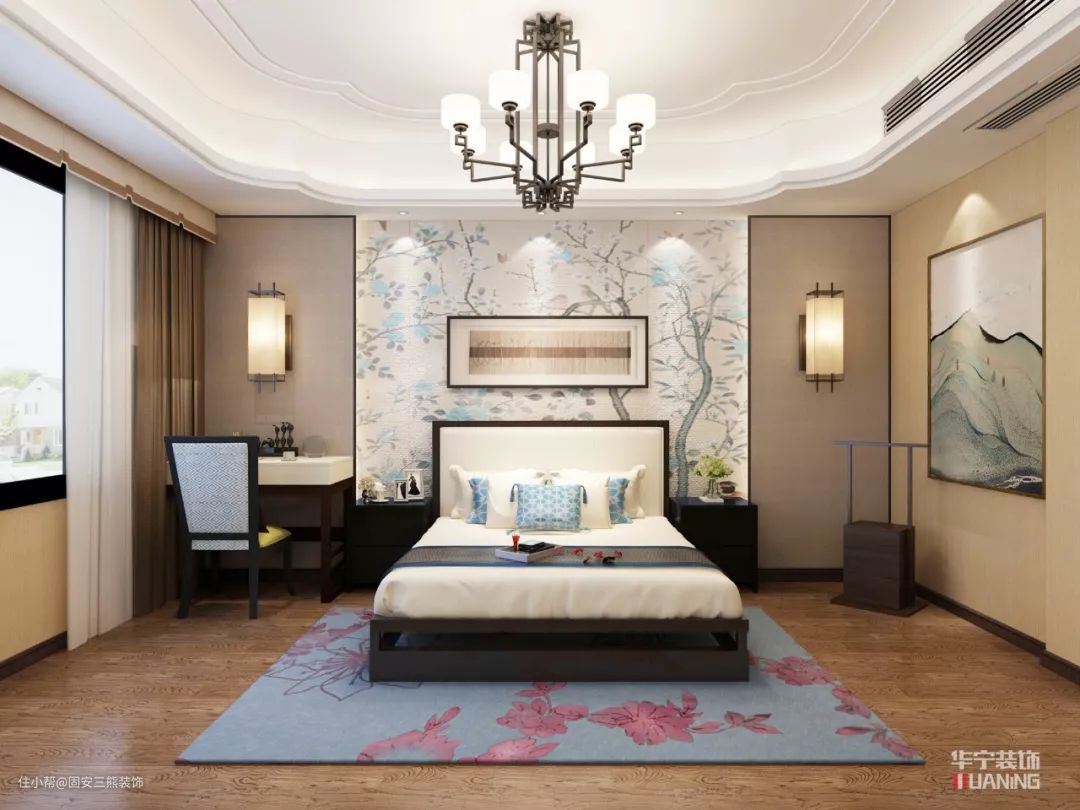 次卧为主人的孙子入住。童年,总有源源不断的奇思妙想,还有细数不完的五彩斑斓。设计师在设计颇费心思,考虑到小孩子偏小,采用四角包围的床,避免孩子的磕磕碰碰。在这个空间里,收藏儿时所有稚嫩的小心事。玩具车、卡通人,久久弥留在记忆里。床头之上采用挂画装饰,宁静而自在,让孩子在这空间中能静下心来思考问题或休息。新中式的卧室又能让孩子感受到中国的风韵。