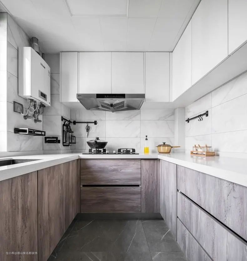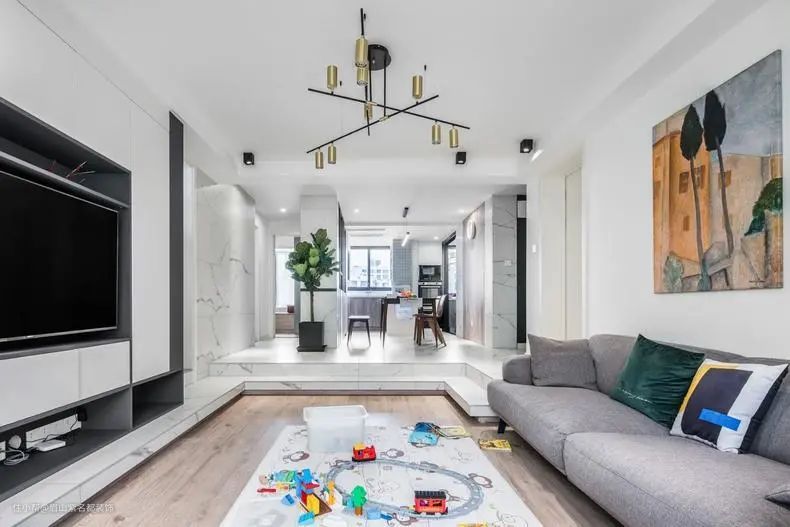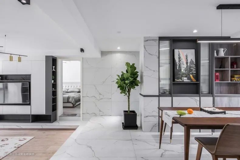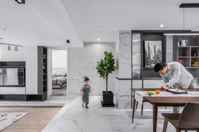 装修效果图:晚上好,今天来欣赏一组112平现代风格旧房重装案例,重新设计后,大量采用ins轻奢感十足的大理石元素,更将客厅做了下沉式设计,单独铺上木地板,和餐厅大理石地面分隔开。
