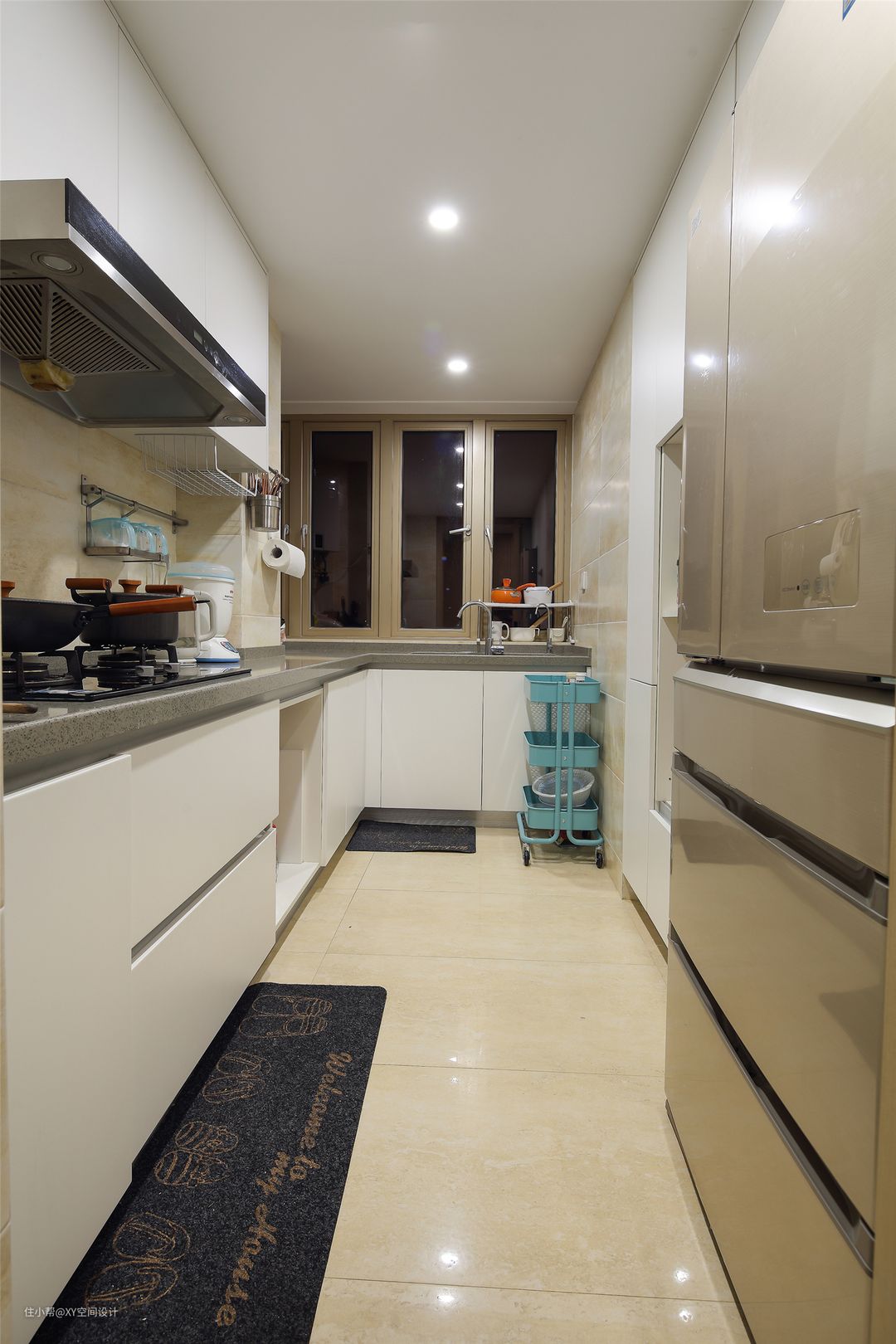 厨房的空间狭长,L型设计的吧台方便走动,当放上业主选购好的厨具,配上淡黄的灯光,温馨的生活气息扑面而来。