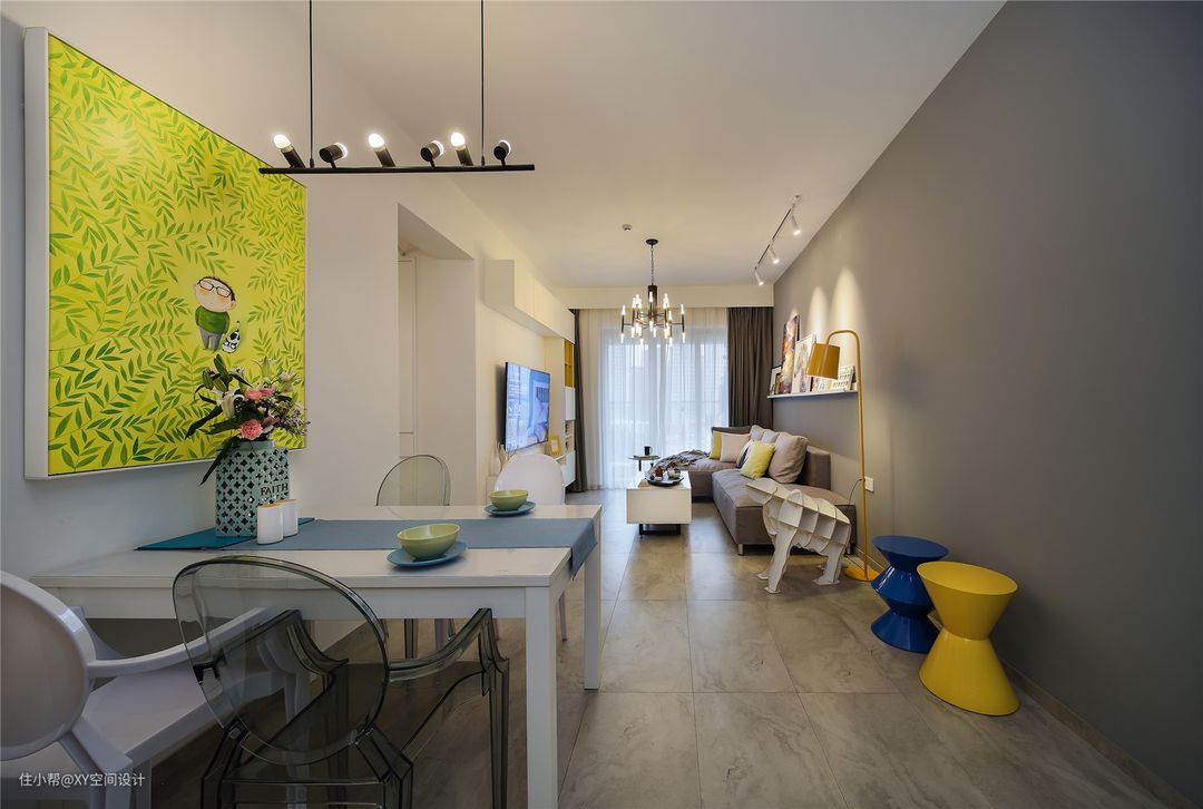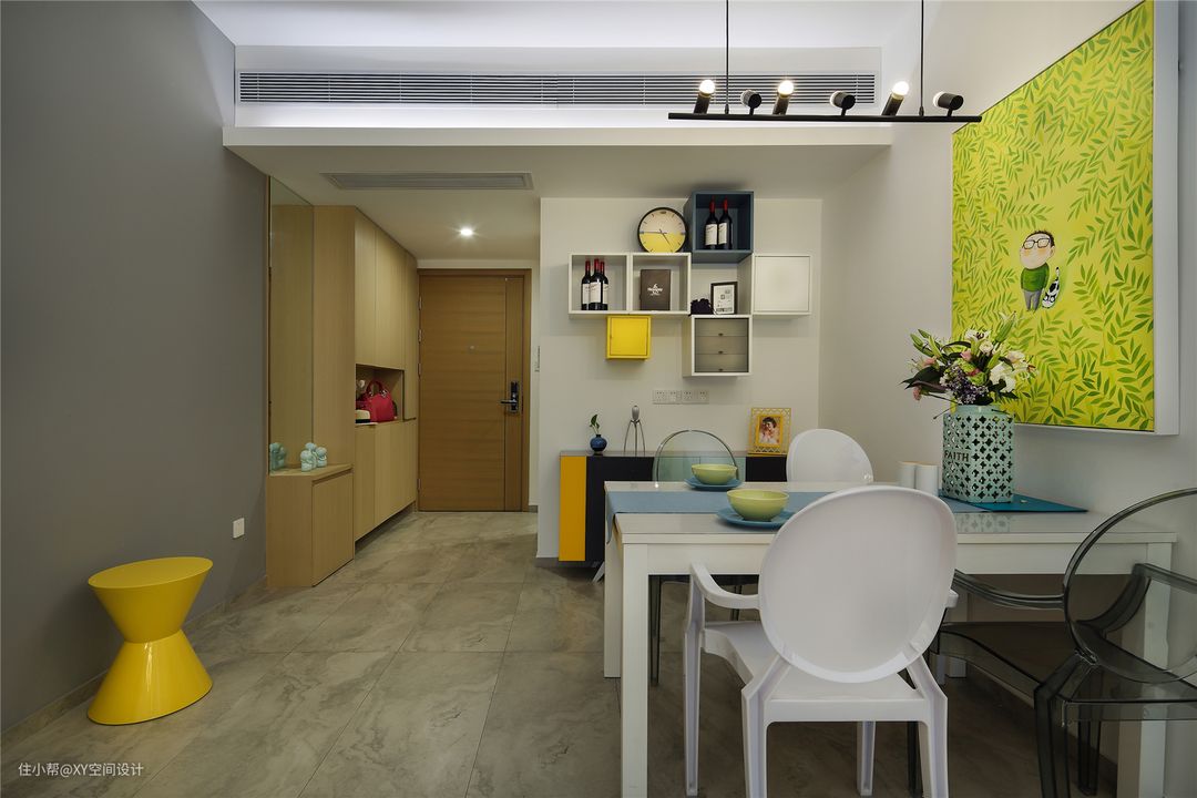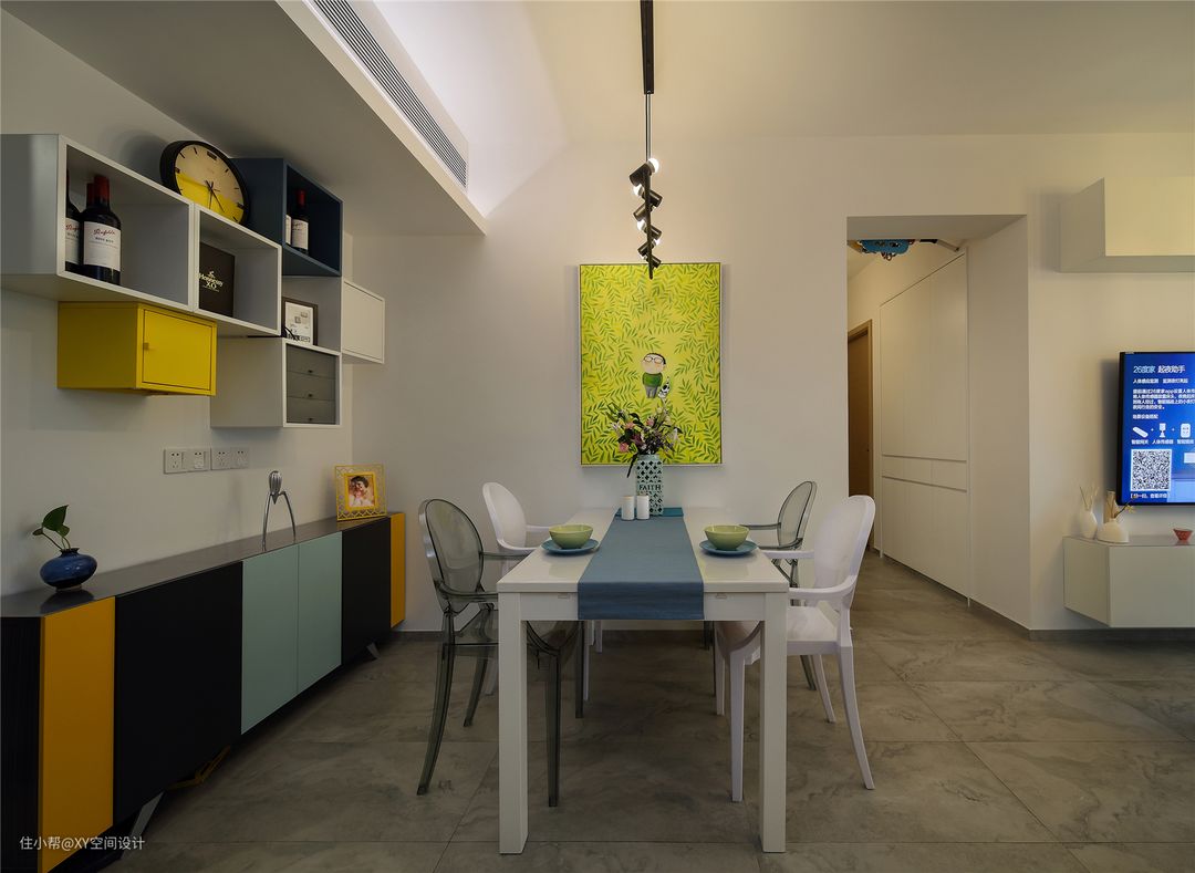 餐厅的设计比较简洁,一套白色的餐桌餐椅和白墙相呼应,背后墙上的方格收纳柜很有设计感,最吸引人注意的便是餐厅里那一幅插画,清新的绿色配上童真的孩子,让人感到幸福。