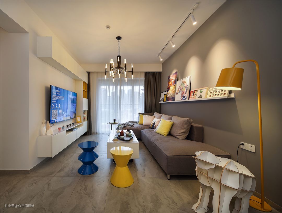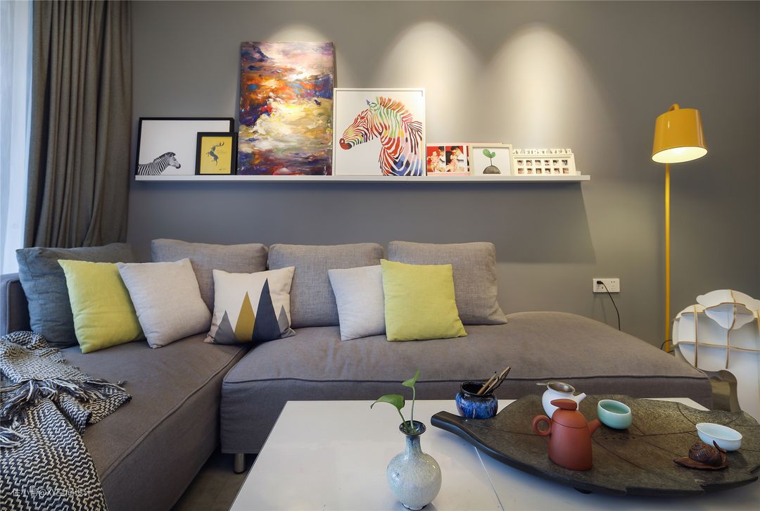 客厅的电视墙位置,业主定制了白色的收纳柜,镂空方格的部分用来摆放玩偶和孩子的照片。沙发和浅灰色的背景墙融为一体,不同色彩的插画和家具配件为客厅增加房间的温馨感。