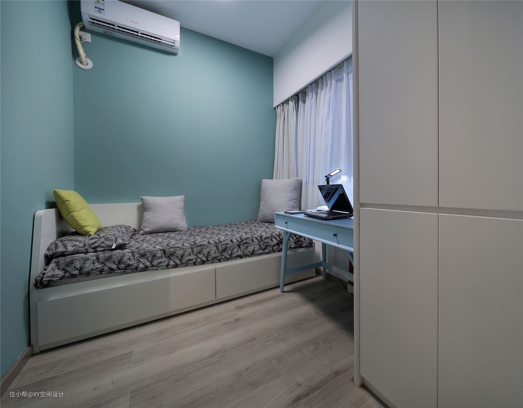 书房里清新蓝的背景墙可以让人瞬间平静内心,靠窗有一张天空蓝的书桌和舒服的榻榻米,业主可以在书桌前完成工作,也在舒服的躺在榻榻米上看书。同时也能当次卧,一房两用。