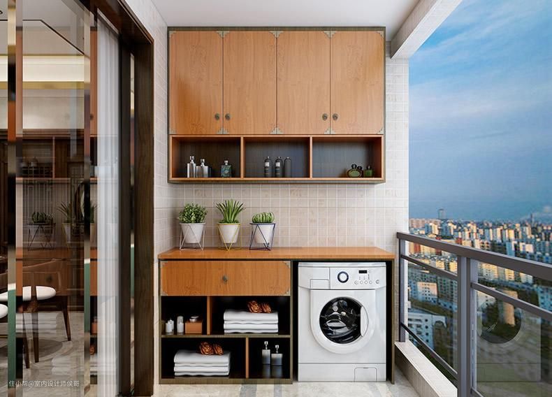 阳台空间宽裕,砖砌的洗衣机收纳柜坚实耐用,墙面打上一排的木质吊柜,满足基本的收纳。
