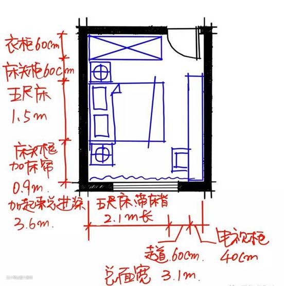最明显的就是卧室,一个标准的卧室,净尺寸应该是3.4米X3.9米,而最小的尺寸,也至少要3.1米X3.6米,才能保证正常的卧室布置。