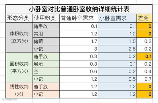 而小卧室如何呢?我们也做了一个统计,小卧室里面,由于舍了很多功能,所以展示的部分以及空台面相应减少。但是常用收纳、随手放收纳,减少的非常有限,详见下表。
