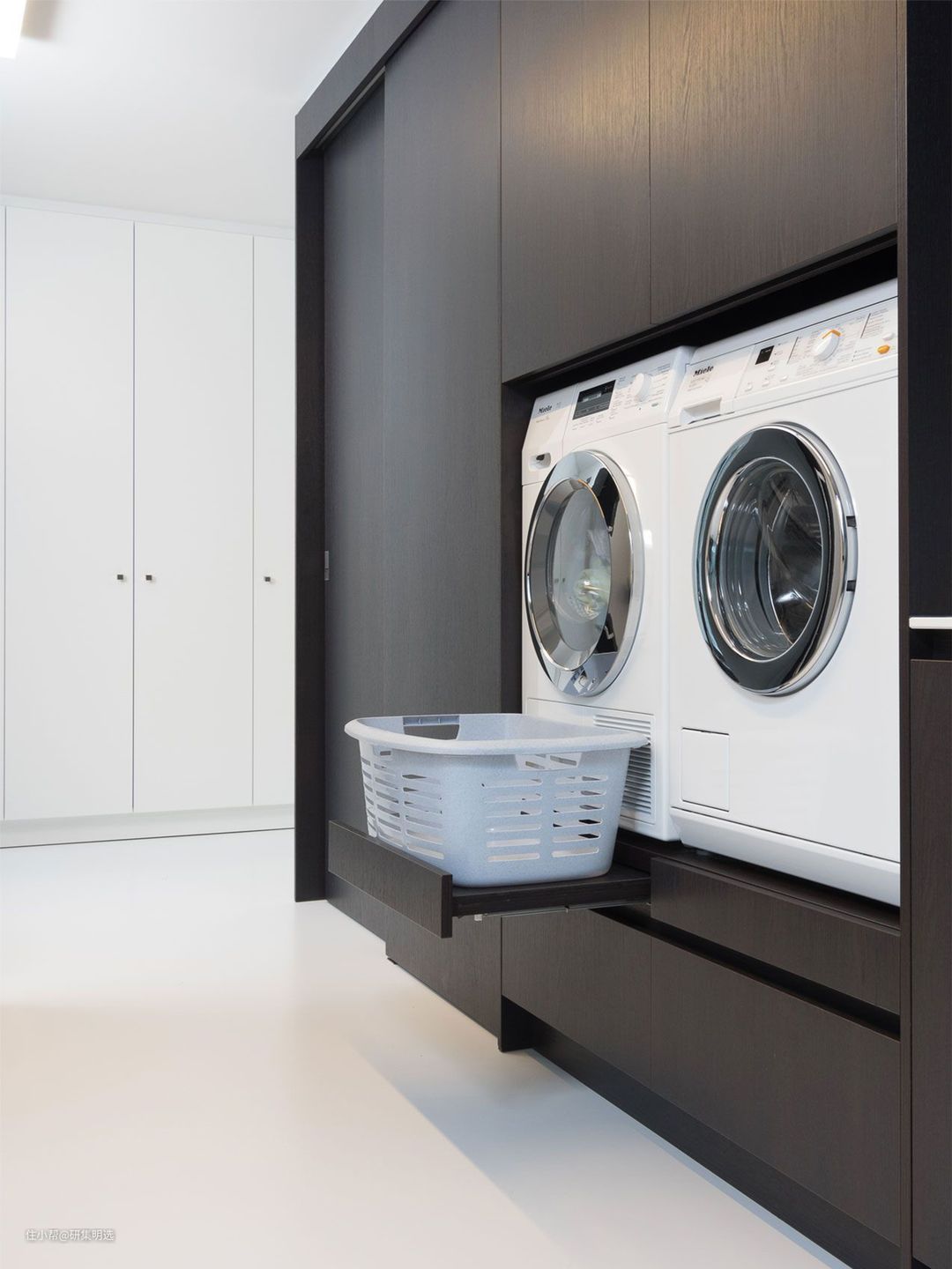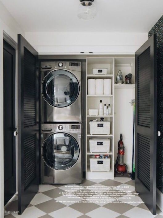 2·洗衣机烘干机横向摆放,下方可留出20-40公分的收纳区。这样拿取衣物再不用蹲下来了,而下方用于收纳的抽屉或柜子,那些重的洗衣液统统放这里,再不用踩楼梯去拿了。也省得家里有老人的,踩空的危险。要是能做个伸缩的抽屉板,就更方便了,往洗衣机里丢衣服的时候还能临时摆放脏衣篓。
