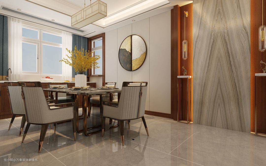 2:开放式餐厅设计,打通了空间中的间隔感,扩大了视觉边界。与客厅形成对望,家人与朋友在用餐时有了更多的互动和趣味。同时,餐厅的吊灯组合拉伸了空间的纵深感