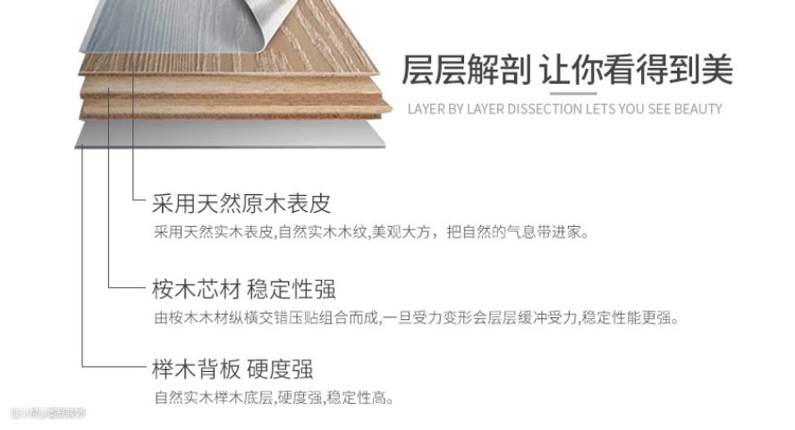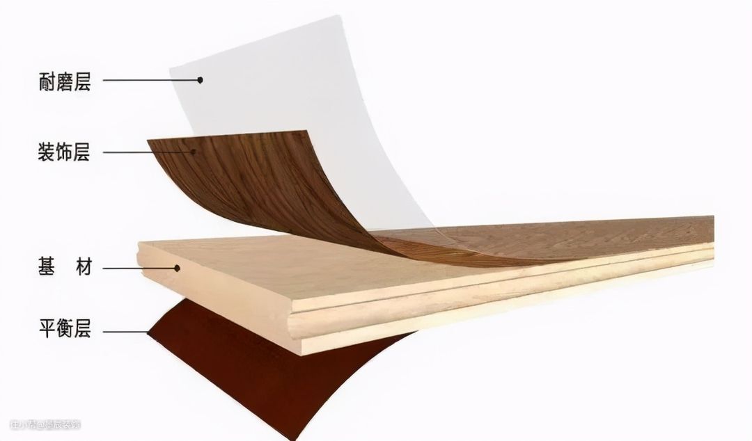 大家也称复合地板、强化地板,它跟实木没有关系,一般是由四层材料复合组成。