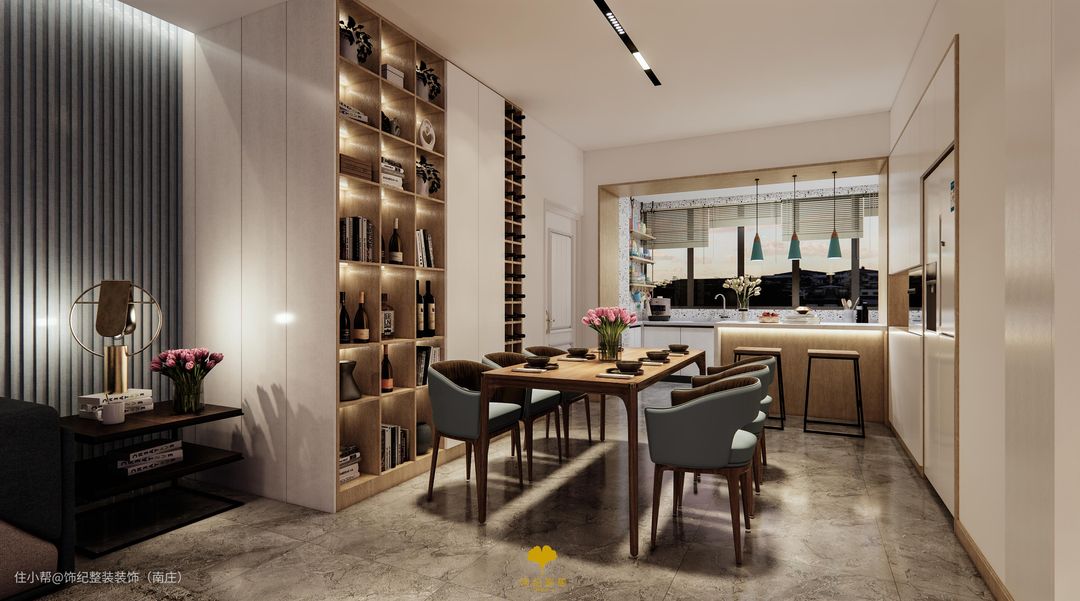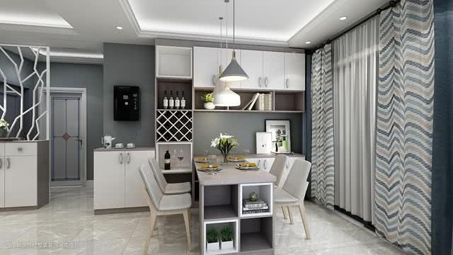 吧台餐边柜根据餐厅空间在餐边柜中间或者靠左边伸出一张吧台,吧台即可以作为隔断,使餐区更温馨和浪漫。