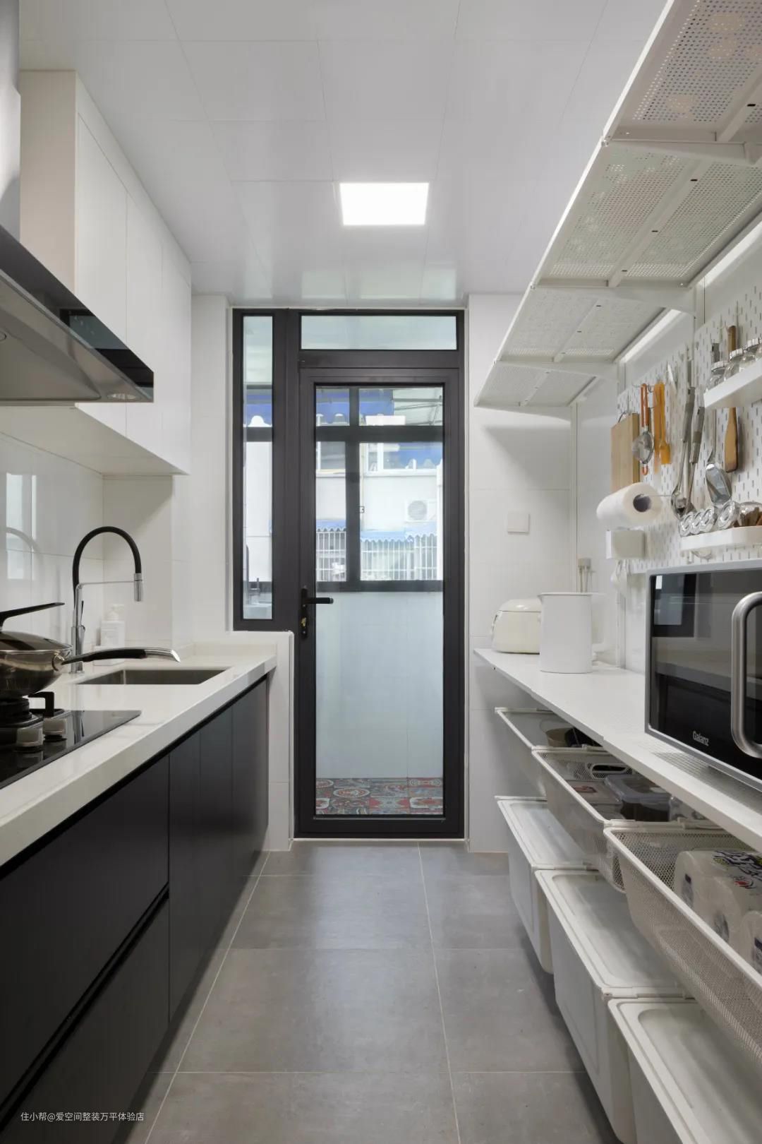 狭长的厨房因合理的布局并没有局促压抑感,小小的厨房阳台也增加了采光和通风,洗衣机摆放在阳台上,也让阳台空间得到了充分的利用。