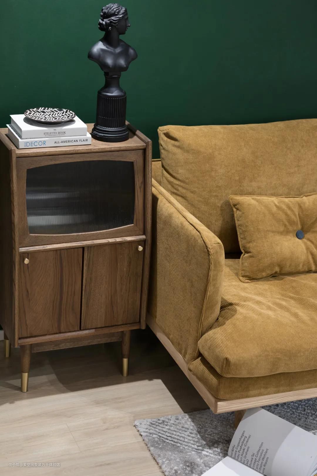 姜黄色的灯芯绒沙发造型新颖,坐感舒适,搭配墨绿色的背景墙,有一种随遇而安的温和气质。