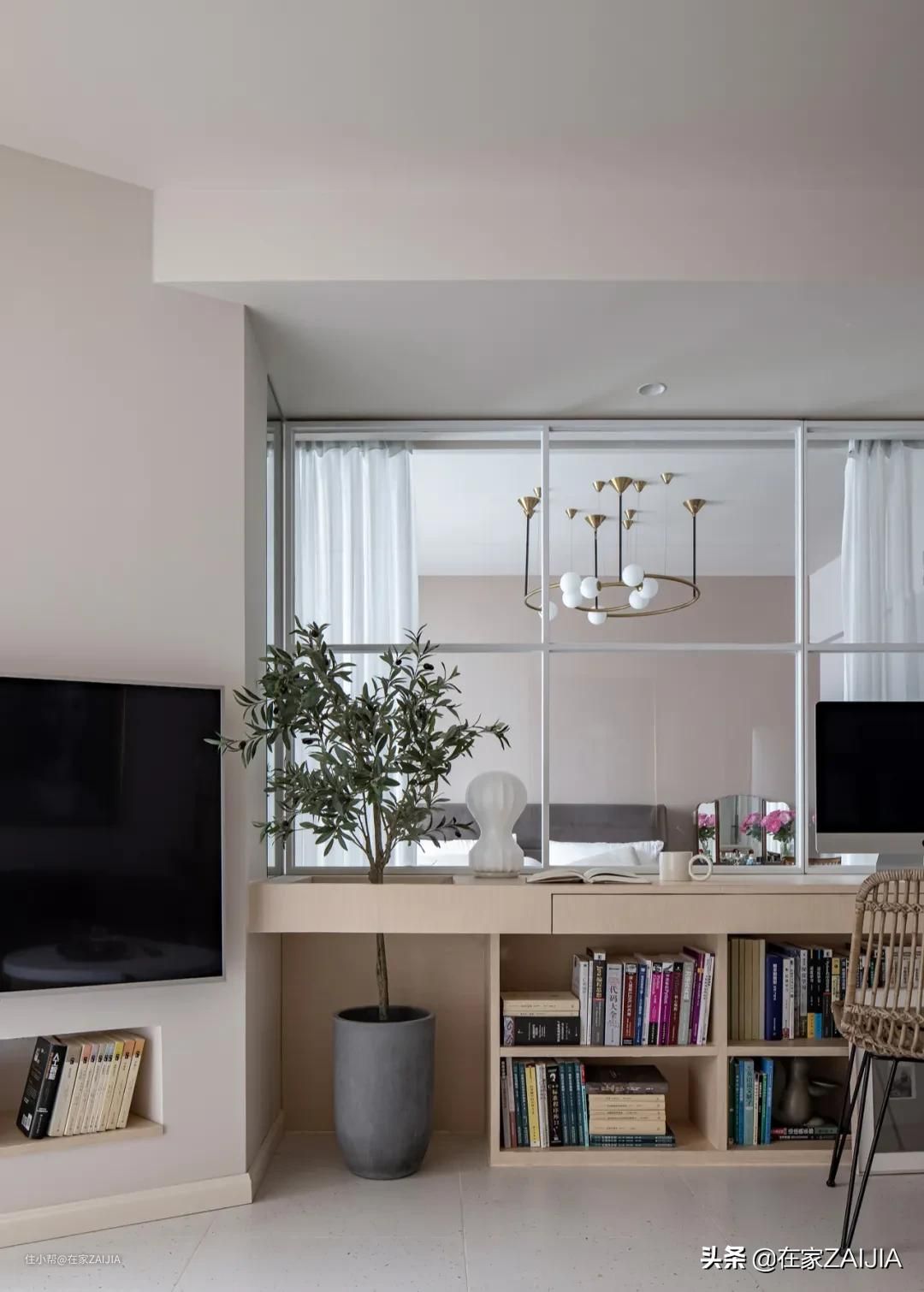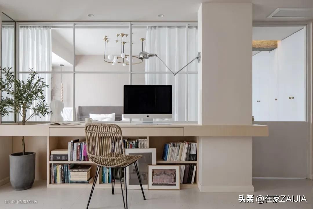 写字台左侧预留了植物的位置,橄榄树的枝条四散、树叶优雅,足不出户就能感受绿意盎然。