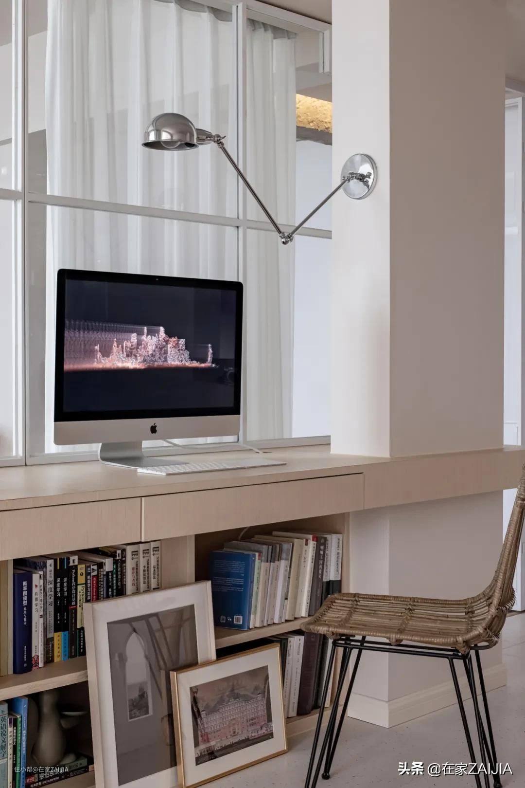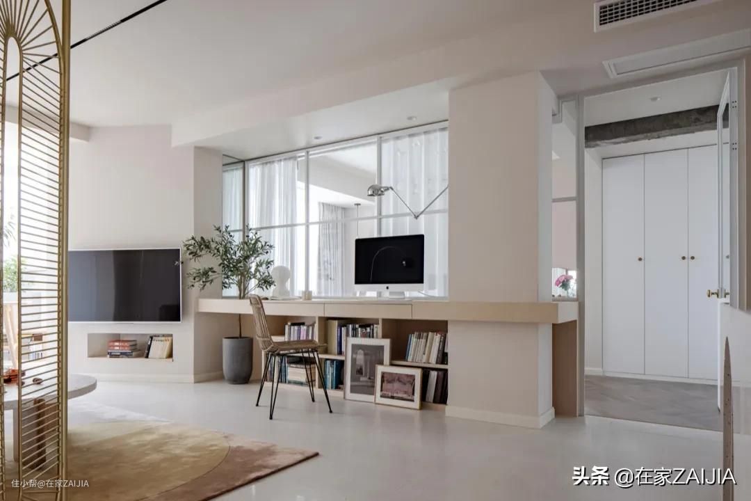 屋主平时看电视的时间少,但有居家办公的需求,所以在客厅现场定制了两人的办公桌,下方以书柜支撑,可收纳两人备课用的书籍。