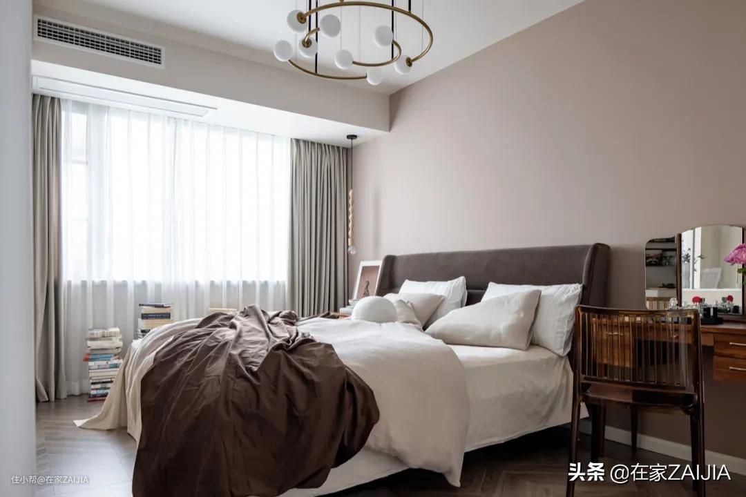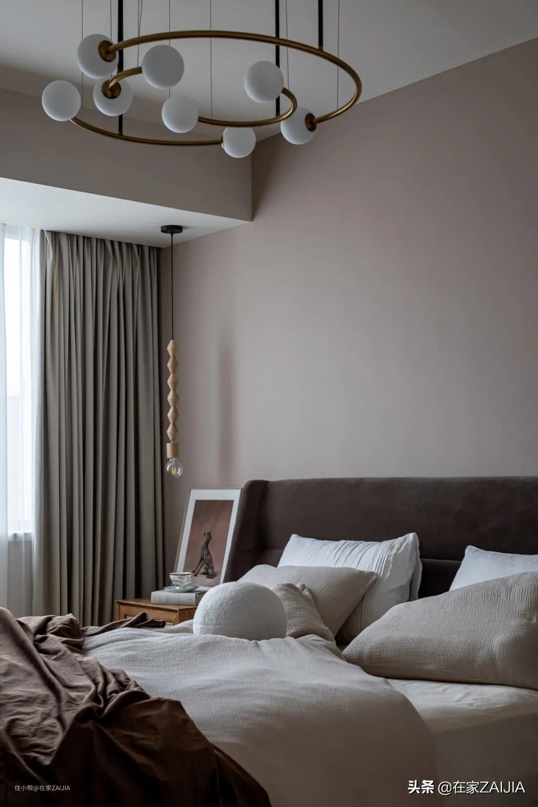 卧室内延续了整屋的大地色系,咖色绒布床头和棉质床品,让空间氛围更加温馨。