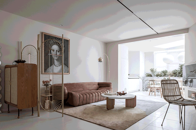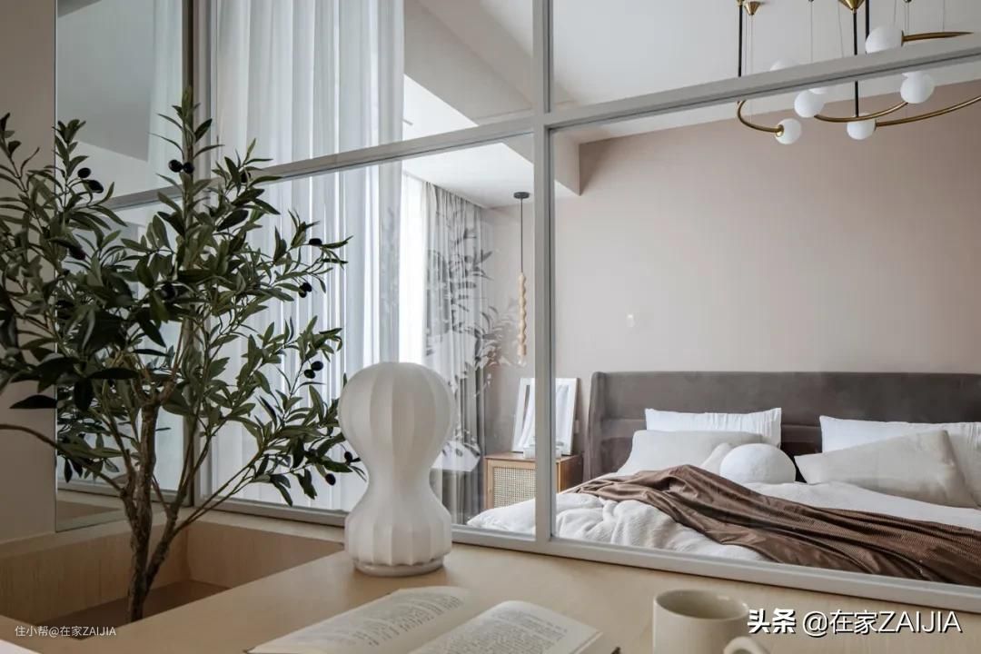 客、卧以玻璃隔断划分空间,设计师在玻璃隔断后加了朦胧纱和遮光帘,屋主能自由调节。